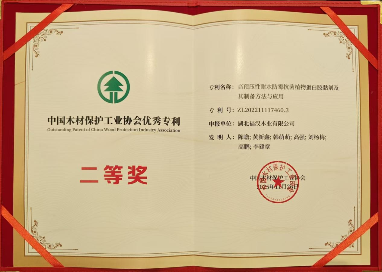 会上,福汉木业自主研发的“高预压性耐水防霉抗菌植物蛋白胶黏剂及其制备方法与应用”技术荣获中国木材保护工业协会优秀专利二等奖,技术创新实力获行业权威认可。